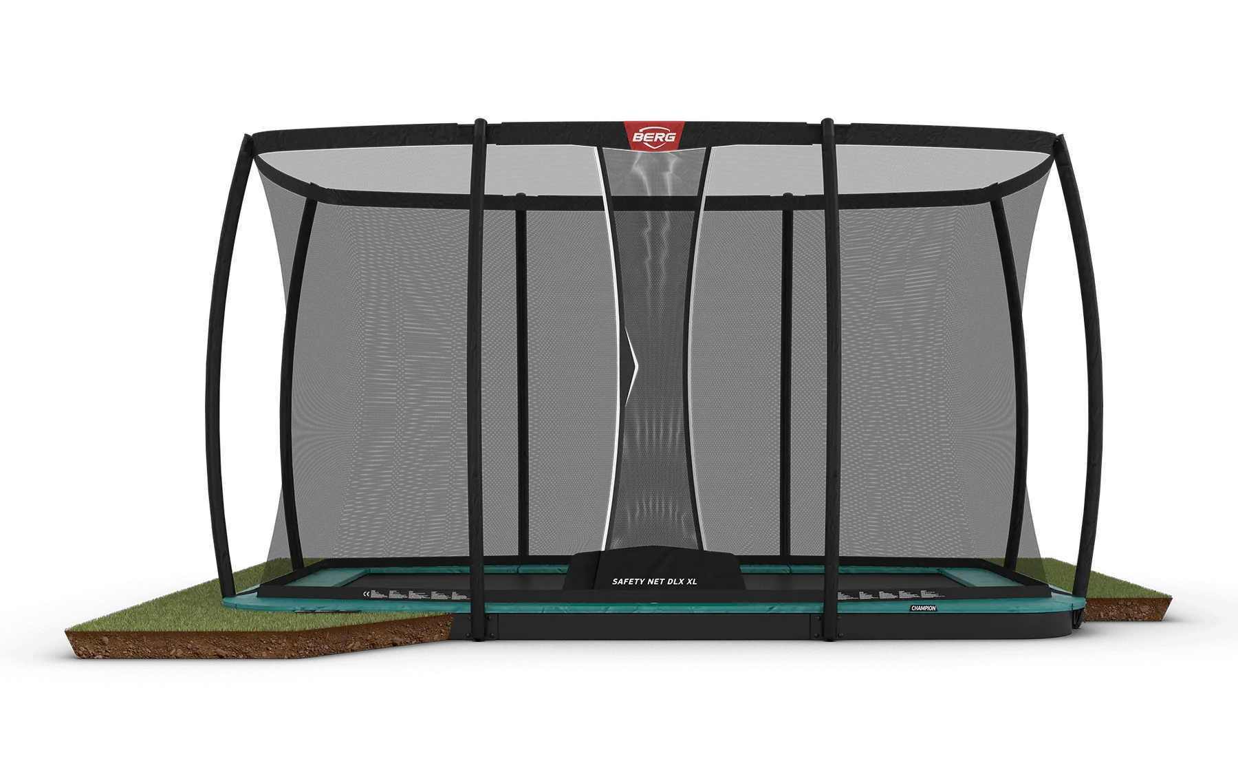 Zabudovaná obdélníková tampolína BERG Ultim Champion FlatGround 410 zelená s ochrannou sítí Deluxe XL