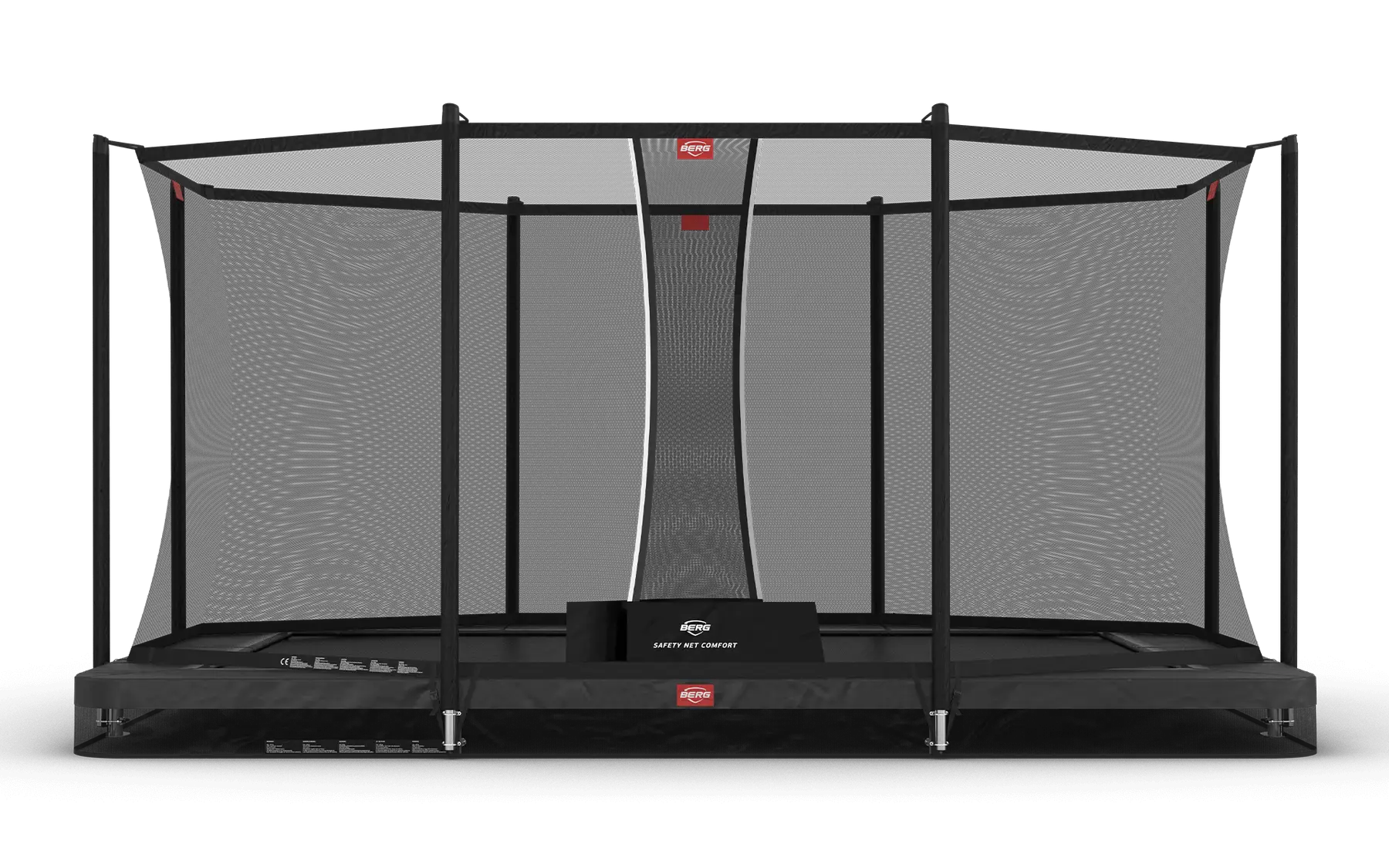Zabudovaná obdélníková trampolína BERG Ultim Favorit InGround 410 šedá s ochrannou sítí Comfort