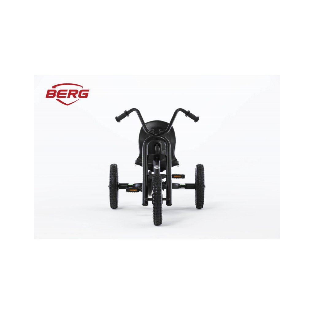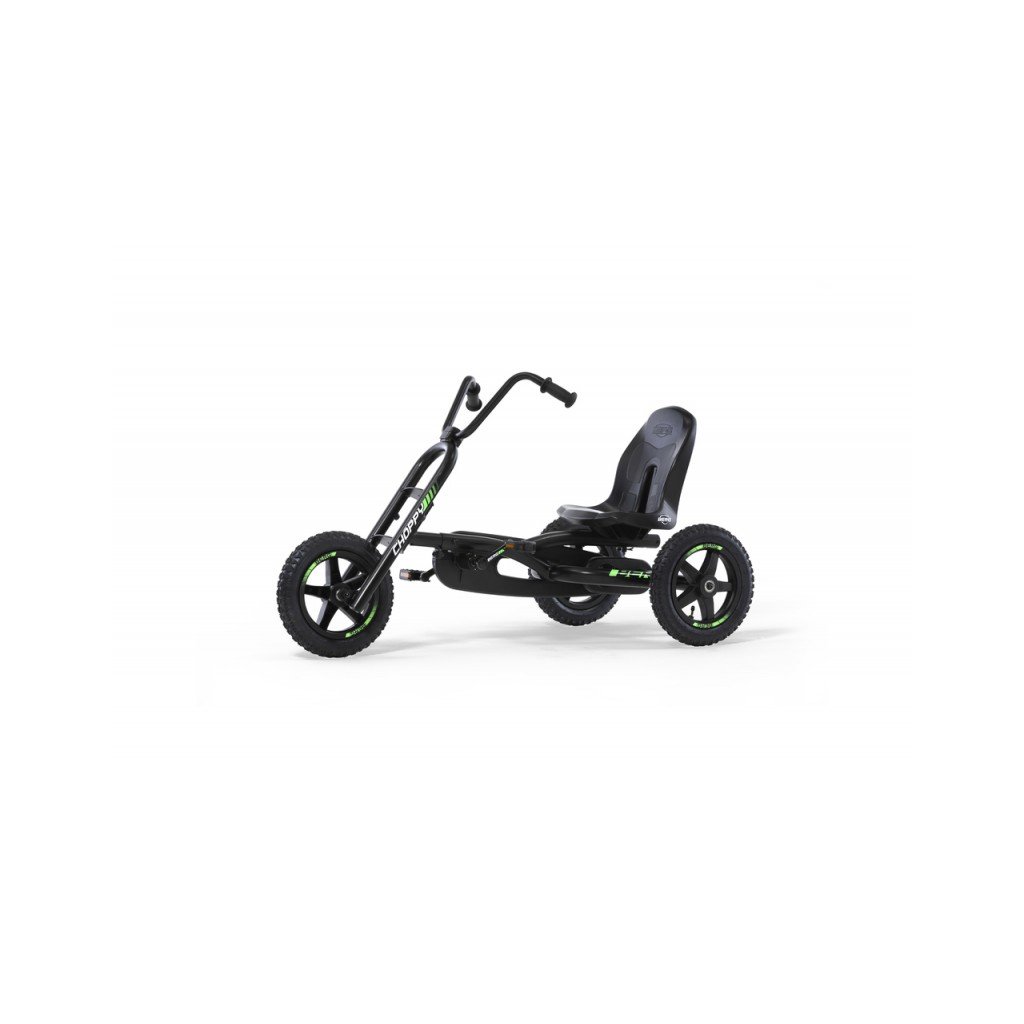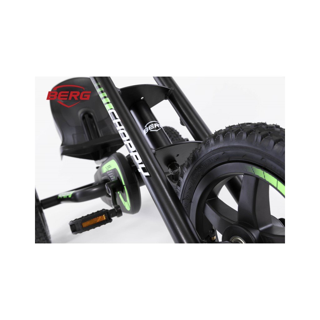 BERG Choppy Neo je vyrobena z pevné oceli, stabilitu v terénu zaručuje výkyvná náprava, tichý chod zajišťují kuličková ložiska.