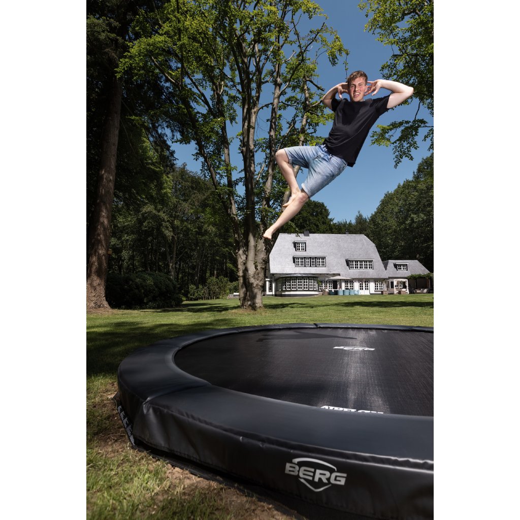 BERG Elite je špičková trampolína od firmy BERG. Pevný ochranný okraj je vyroben z nejlepšího materiálu, což činí BERG Elite vhodným pro intenzivní použití. Kromě toho je ochranný okraj Elite vysoce odolný proti UV záření. Trampolíny jsou vybaveny pružinami TwinSpring a speciální skákací podložkou AirFlow Pro, která poskytuje maximální komfort skákání. BERG Elite je k dispozici v provedeních Regular, InGround a FlatGround. Skákací podložky AirFlow Pro umožňují průchod více vzduchu. To vytváří menší odpor a umožňuje ti skákat výše. S pružinami TwinSpring budeš skákat výše. Tyto pružiny jsou chytře namontovány ve tvaru V. Více pružin a více skákací síly. Skákání vysoko je skvělé, ale pouze pokud to můžeš dělat bezpečně. Silný ochranný okraj poskytuje bezpečnost a vydrží déle díky vysoké odolnosti proti UV záření. Větší skákací síla znamená větší zatížení rámu. Tento rám snadno zvládne dodatečné zatížení, takže je velmi bezpečný!