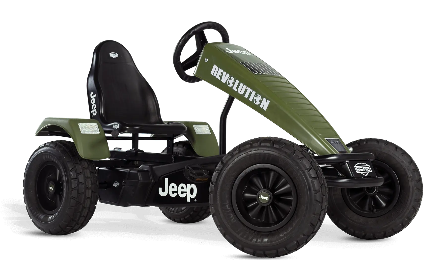 BERG Jeep® Revolution pedal go-kart XXL-BFR je šlapadlo určeno pro dobrodružné výpravy v terénu. Díky své robustnosti a velkým pneumatikám zvládne každý terén.